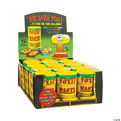 Toxic waste sour candy assortment pack includes all the favorites toxic waste drums smog balls slime licker and a toxic waste sticker.